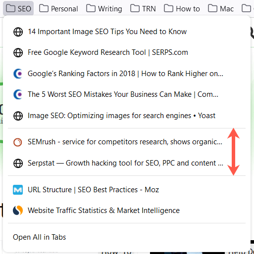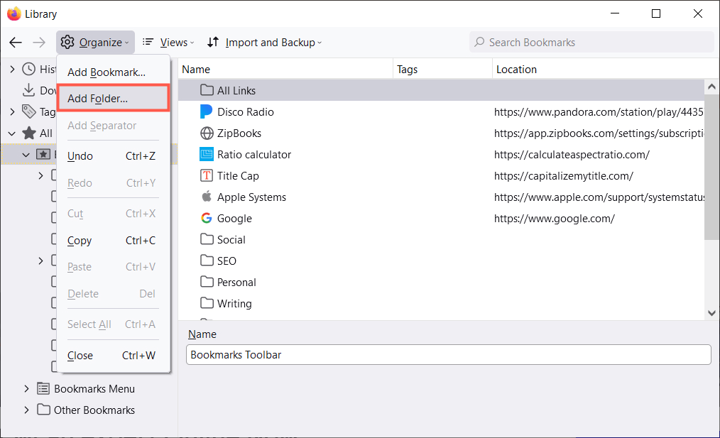 Você verá Todos os Favoritos à esquerda, que pode expandir para ver a Barra de Ferramentas de Favoritos, o Menu de Favoritos e quaisquer pastas que você criar.