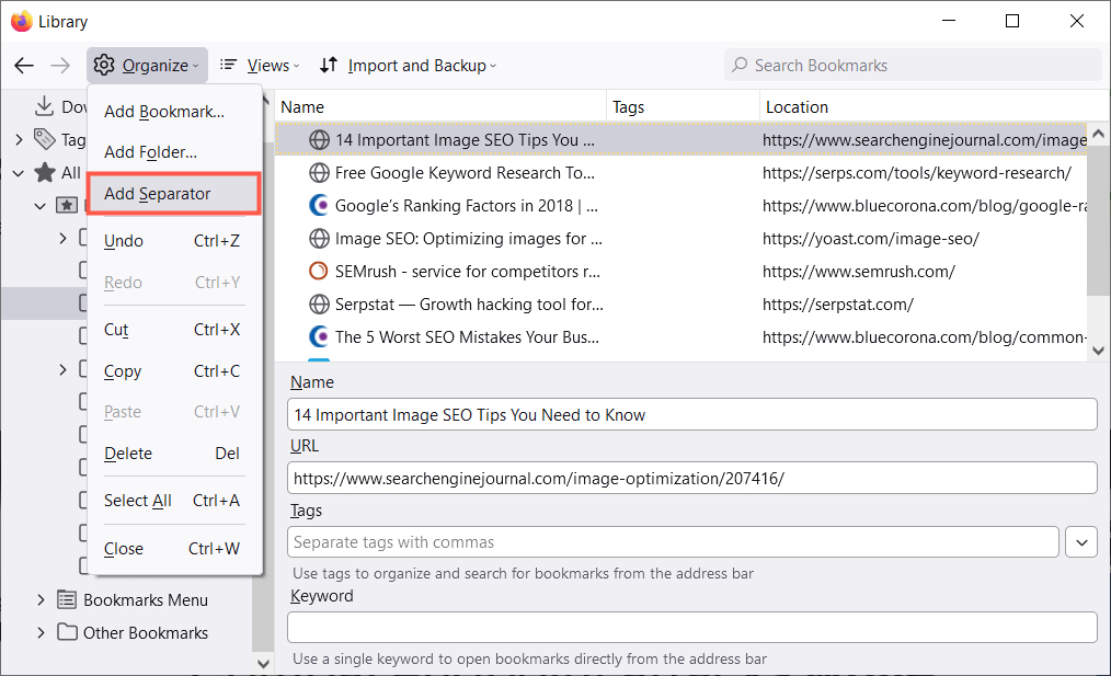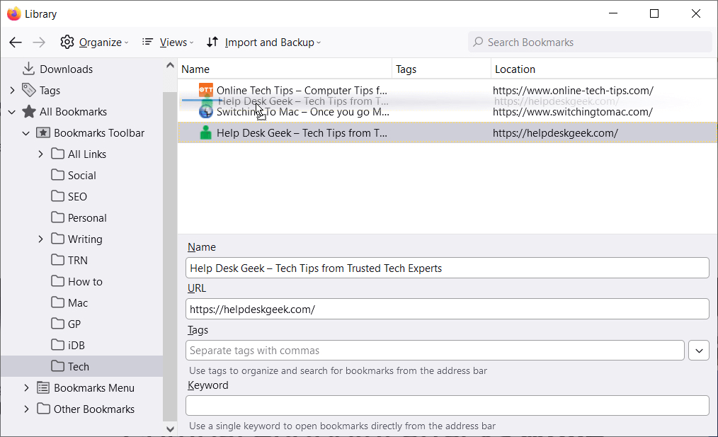 Com a janela Biblioteca aberta, você pode organizar os marcadores reorganizando-os. Isso ajuda você a encontrar aqueles que você usa com mais frequência, colocando-os no topo da lista ou aqueles que você raramente usa no final.