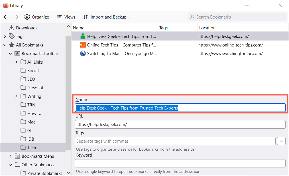 Ao marcar uma página da Web, você não pode alterar o nome padrão que aparece. Em alguns casos, o nome pode ser longo ou simplesmente não ser facilmente reconhecível. Felizmente, você pode renomear um marcador para algo mais significativo para você.
