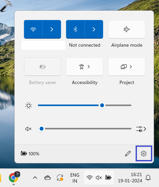 No lado direito da barra de tarefas, você verá o ícone da bateria/volume/ícones de Wi-Fi. Clique nesses ícones e clique no botão “Configurações”Ícone para abrir o aplicativo Configurações.