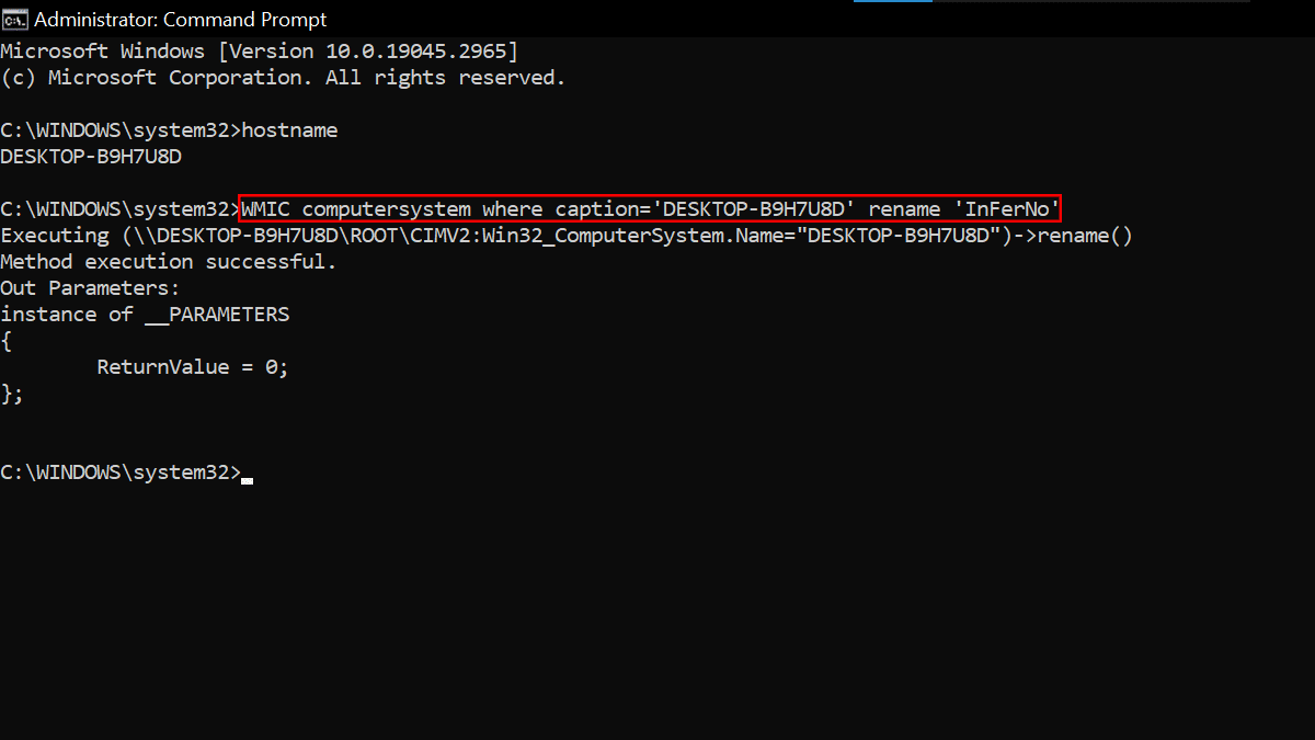 No comando, atualize suas informações e use aspas simples ao especificar os nomes atuais e novos. Por exemplo, sistema de computador WMIC onde caption=’DESKTOP-B9H7U8D'renomear'InFerNo‘