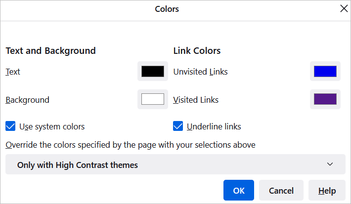 Para alterar o estilo ou tamanho da fonte ou substituir as cores padrão do Firefox para fundos de texto e páginas da web, vá para Configurações.