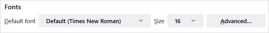 Em seguida, selecioneAvançadopara escolher estilos e tamanhos de fonte específicos para fontes proporcionais, serifadas, sem serifa e monoespaçadas. Você também pode selecionar um tamanho mínimo de fonte.