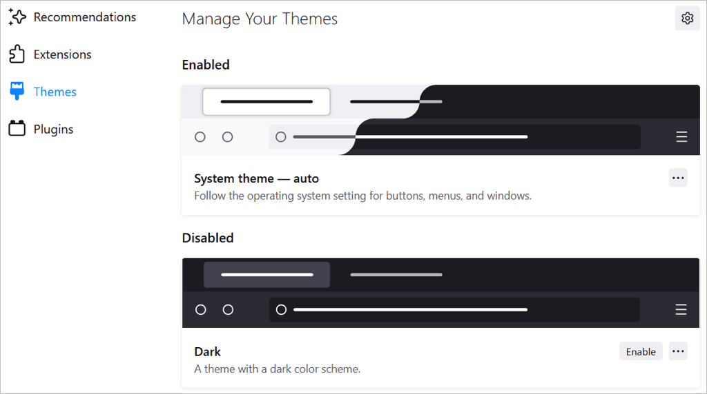 Você verá então a seção Gerenciar seus temas nas configurações do navegador. Os temas instalados são exibidos na parte superior da seção Ativado ou Desativado. Isso permite instalar vários temas e simplesmente selecionarHabilitarpara aquele que você deseja no momento.