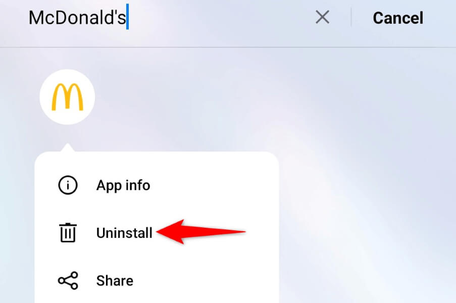 - Toque e segureMcDonald’sna tela inicial do seu telefone.