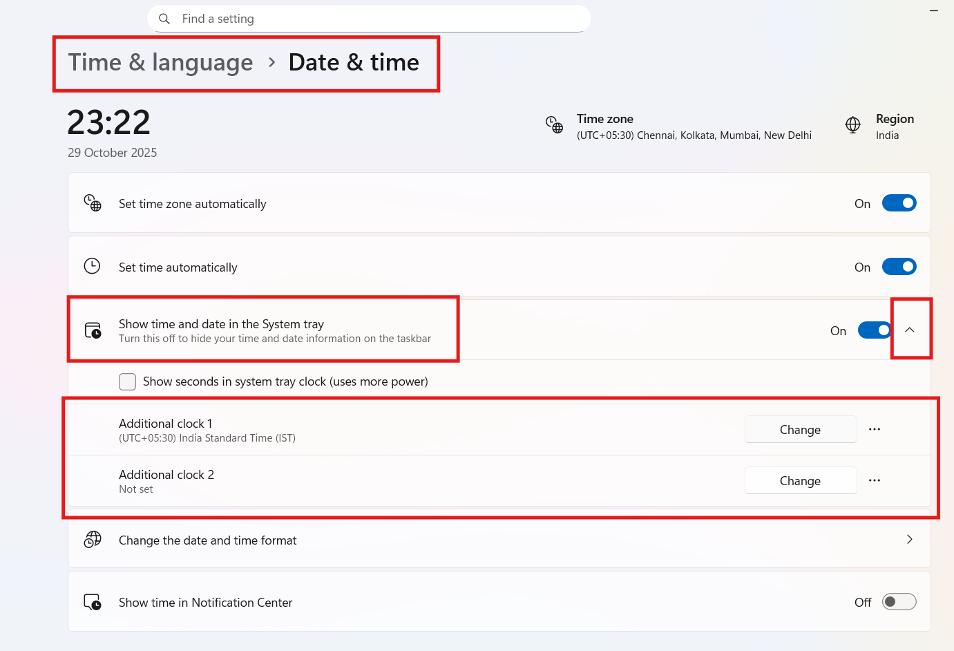2. Ative Mostrar hora e data na bandeja do sistema e clique no ponteiro próximo à barra de alternância.