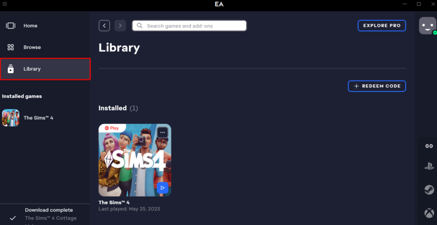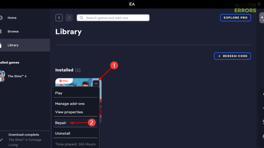 - Clique no ícone marcado com três pontos, próximo ao Apex Legends. Então, escolhaRepararos arquivos do jogo (conforme mostrado no exemplo do The Sims 4 abaixo).