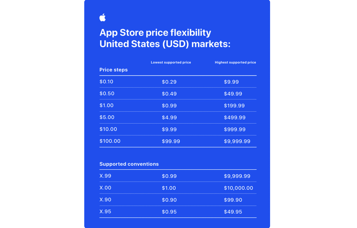 Para fornecer aos desenvolvedores de todo o mundo ainda mais flexibilidade, os preços — que começarão em US$ 0,29 e, mediante solicitação, chegarão a US$ 10.000 — oferecerão uma seleção aprimorada de preços, aumentando gradativamente em todas as faixas de preço (por exemplo, a cada US$ 0,10 até US$ 10; a cada US$ 0,50 entre US$ 10 e US$ 50; etc.).