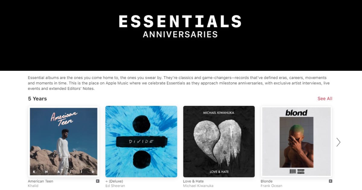 No dia 21 de maio, a Apple apresentará o primeiro álbum da seção, OK Computer do Radiohead, que completa 25 anos. Além de destacar o aniversário do álbum, a Apple também oferecerá seleções do álbum, videoclipes e um programa especial da Apple Music Radio, também chamado Essentials Anniversaries, com o DJ Matt Wilkinson.
