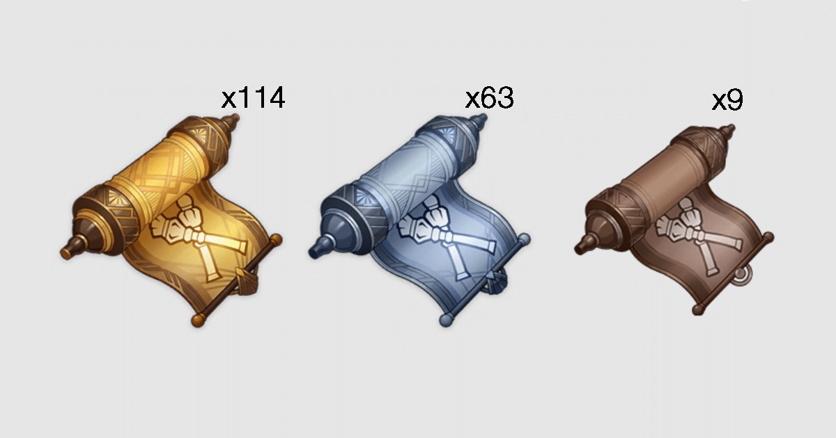 - Insígnia estúpida: Tal como acontece com outros personagens Fatui, Arlecchino exige que estes sejam derrubados por mobs Fatui. Você precisará de 36 insígnias de recruta, 96 de sargento e 129 insígnias de tenente.