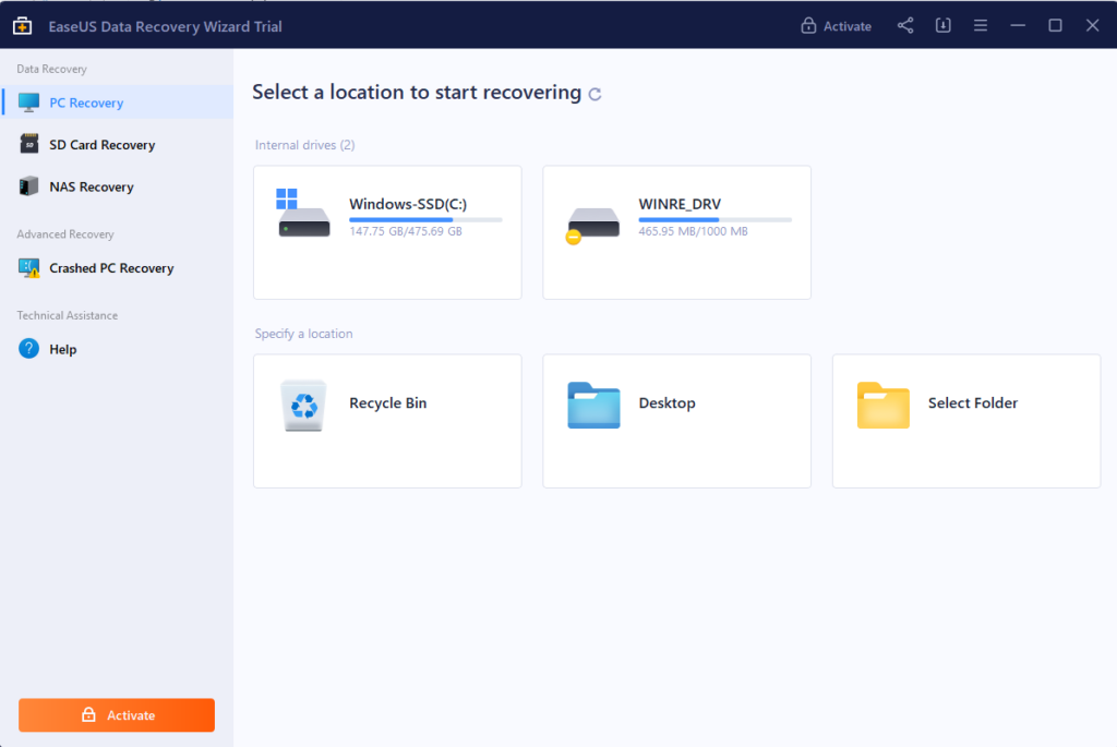 Ao abrir o EaseUS Data Recovery Wizard em seu PC com Windows 11, ele solicita que vocêescolha um local para recuperar todos os seus dados perdidos e excluídos acidentalmente. Por exemplo, permite recuperar dados de quatro locais variados: Lixeira, Unidades Internas, Área de Trabalho e Pastas. Além disso, a melhor parte é queverifica completamente o local selecionado em alguns segundose exibe todos os dados perdidos encontrados e que podem ser recuperados em um só lugar.