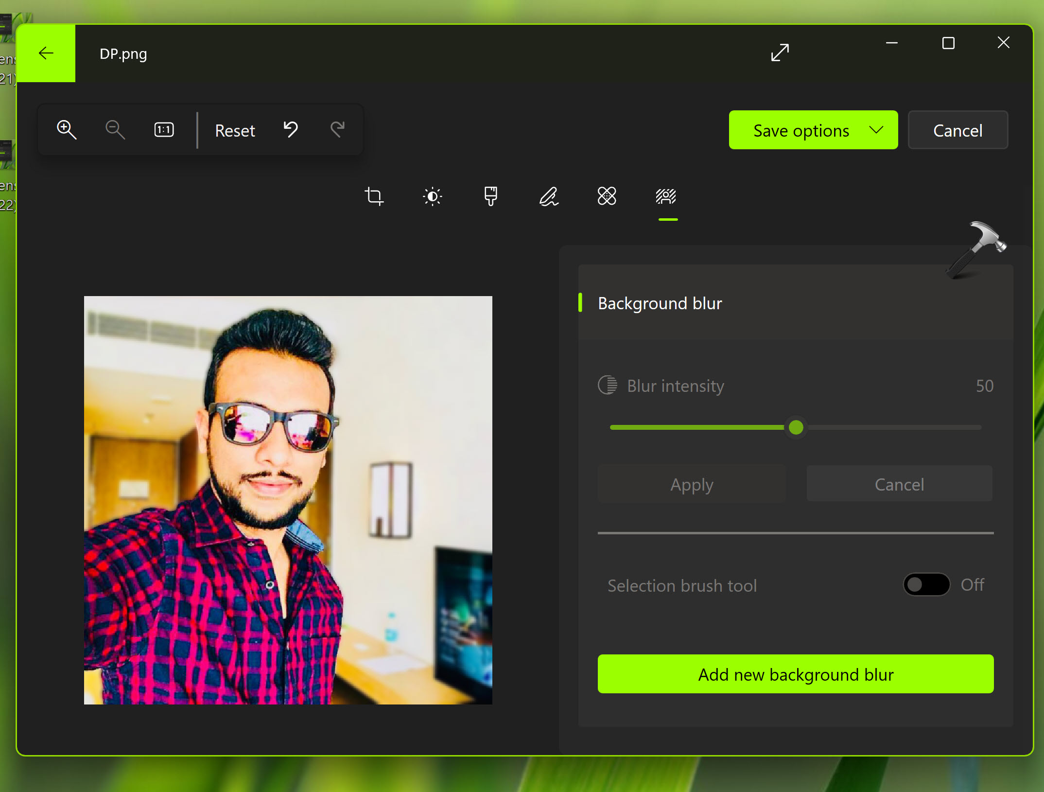 Agora o aplicativo Fotos detectará automaticamente o fundo da sua imagem. Agora ele pode aplicar automática ou manualmente o efeito de desfoque de fundo. Você pode definir a intensidade do desfoque manualmente, dependendo de como desfocar o fundo desejado. Além disso, você pode ativar a opção da ferramenta Pincel de seleção aqui e selecionar uma ferramenta de pincel. Quando estiver satisfeito com o desfoque de fundo, você pode clicar no botão Aplicar.