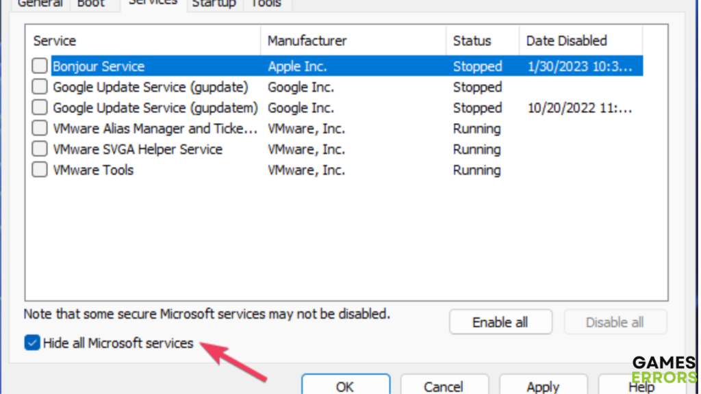 - Em seguida, mude para a guia Serviços para selecionarOcultar toda a Microsoft serviços.