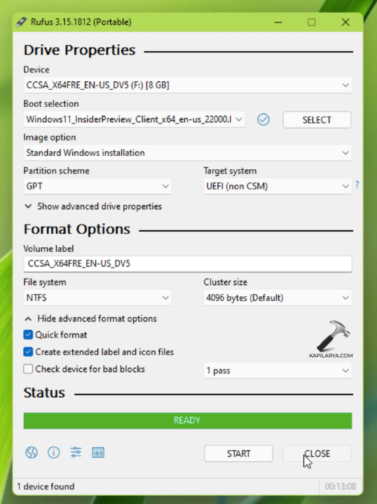 3.Instale e inicie o Rufus em seu sistema. Agora faça as seguintes seleções: