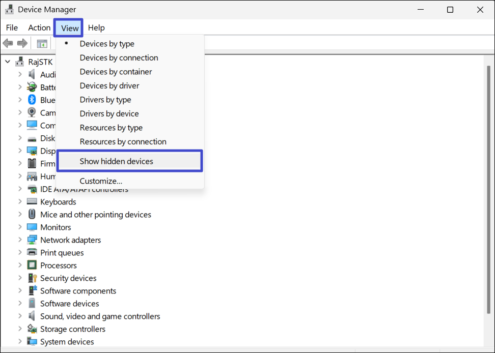 2. No Gerenciador de Dispositivos, clique em “Visualizar“, e selecione “Mostrar dispositivos ocultos“.