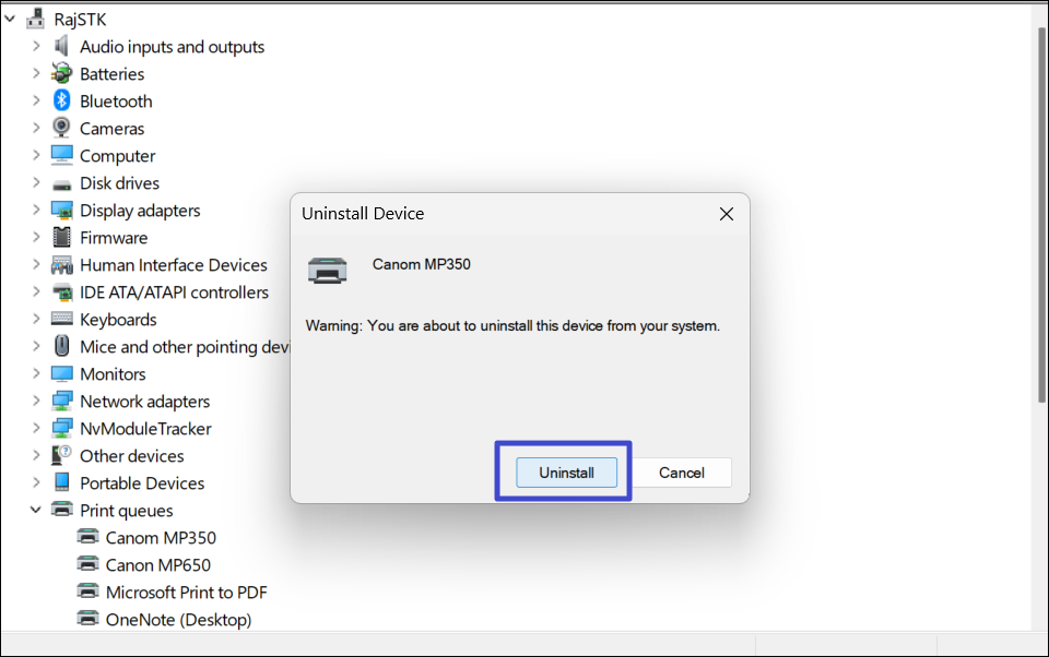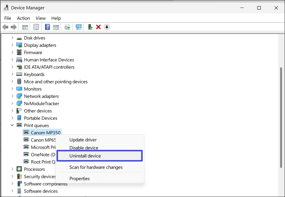 4. Clique com o botão direito na impressora que deseja remover e selecione “Desinstalar dispositivo“.