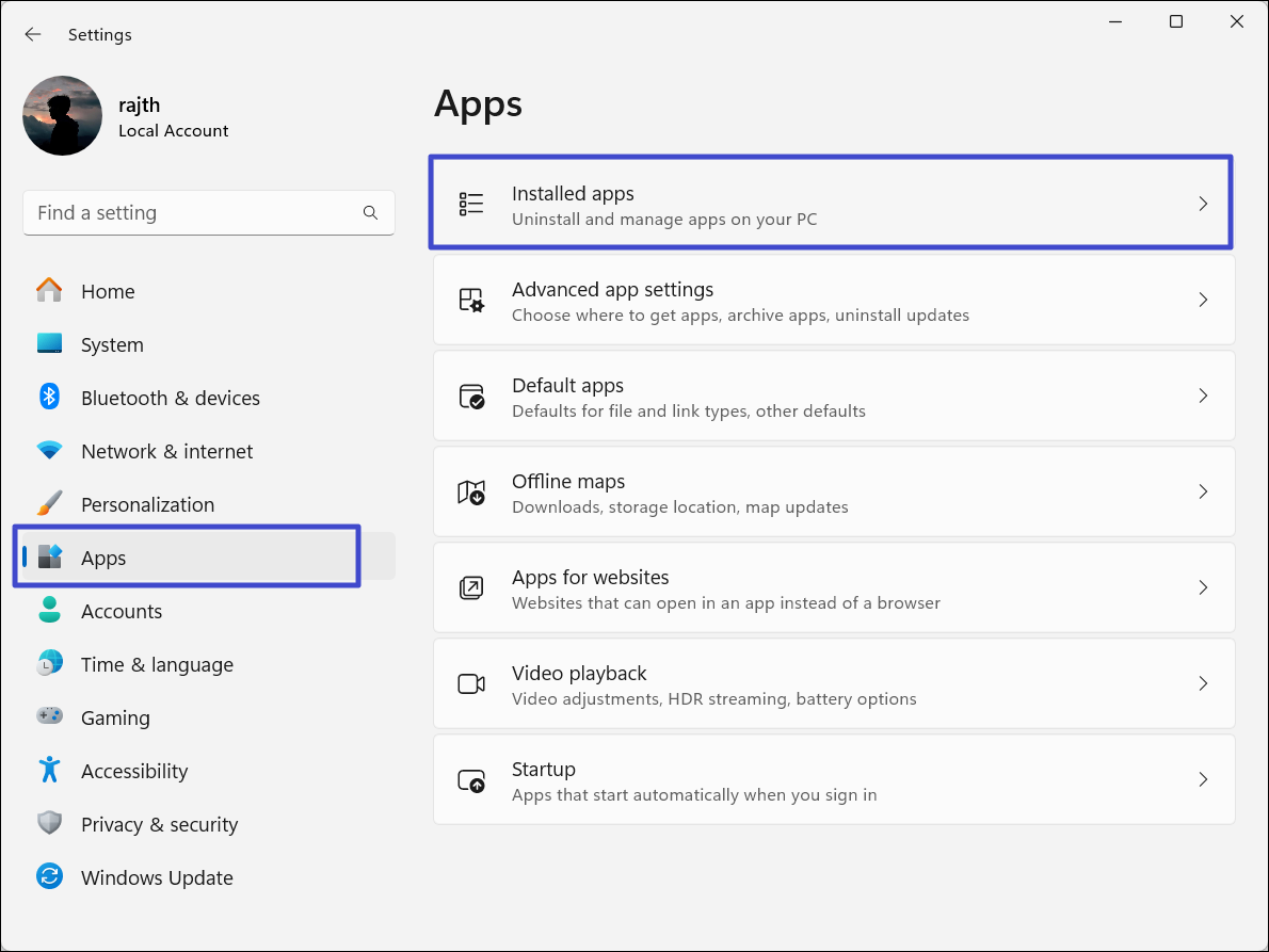 2. Selecione “Aplicativos”No painel esquerdo e clique em“Aplicativos instalados“.