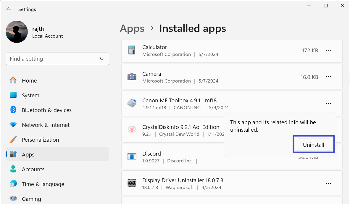 4. Clique notrês pontosao lado do aplicativo e selecione “Desinstalar“.