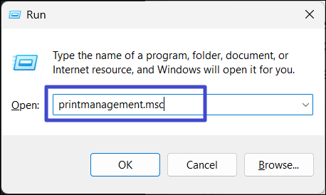 1. Abra a caixa Executar Comando, digite “gerenciamento de impressão.msc”,e pressione Enter para abrir o Gerenciamento de impressão.
