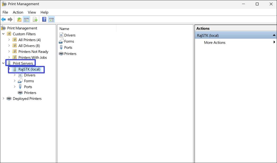 2. No painel esquerdo, expanda o “Servidores de impressão”e, em seguida, expanda o servidor de impressora local (igual ao nome do dispositivo).