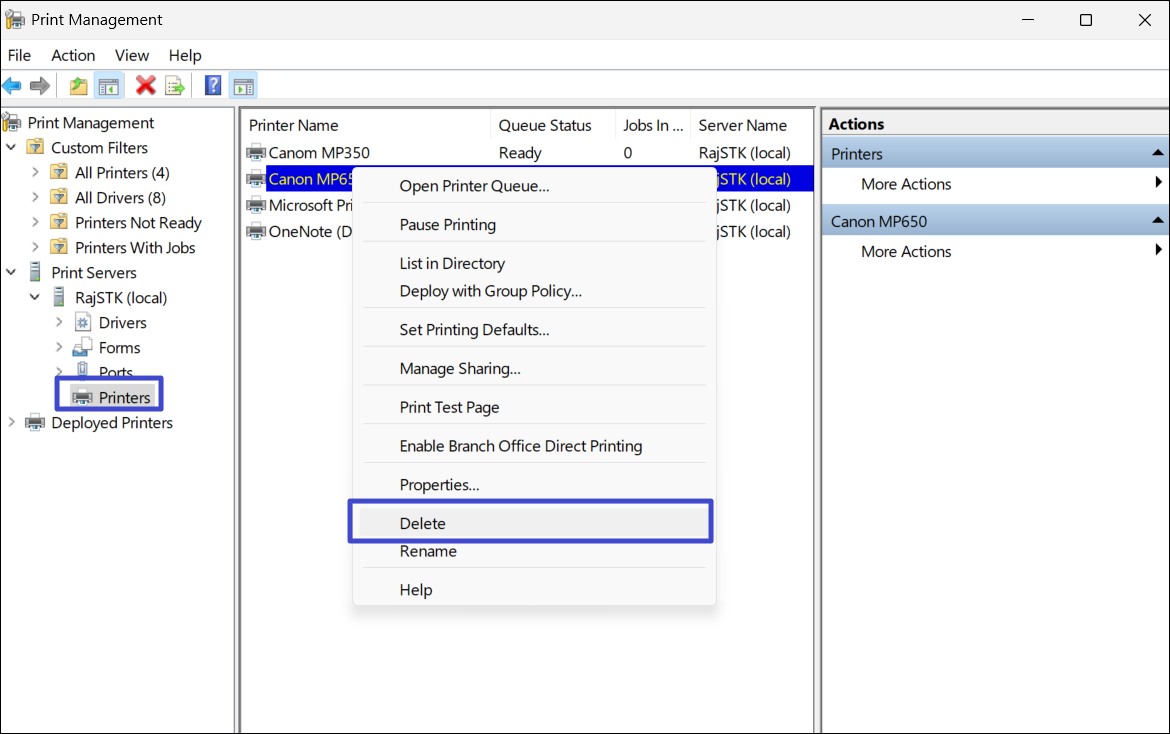 4. Clique com o botão direito na impressora que deseja excluir no painel direito e selecione “Excluir“.