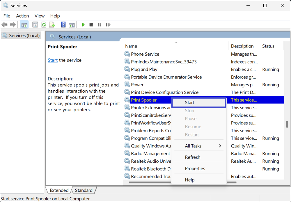 6. Clique com o botão direito noSpooler de impressoraserviço e selecione “Começar”Para reiniciar o serviço.