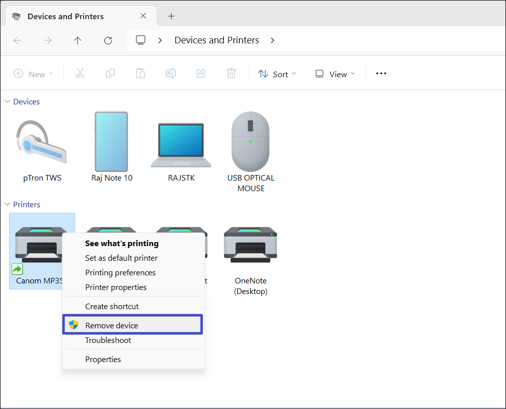 shell:::{A8A91A66-3A7D-4424-8D24-04E180695C7A}2. Quando a janela Dispositivos e Impressoras abrir, clique com o botão direito na impressora que deseja remover e selecione “Remover dispositivo“.
