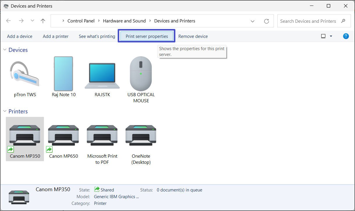 3. Selecione qualquer uma das impressoras e clique em “Propriedades do servidor de impressora”Na barra de menu.