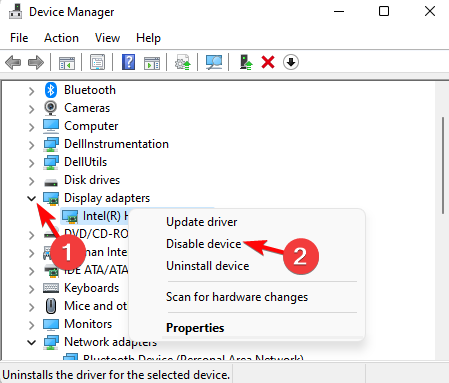 - Em seguida, expandaAdaptadores de vídeo, clique com o botão direito na placa de vídeo integrada [Intel(R) HD Graphics] e selecioneDesativar dispositivo.