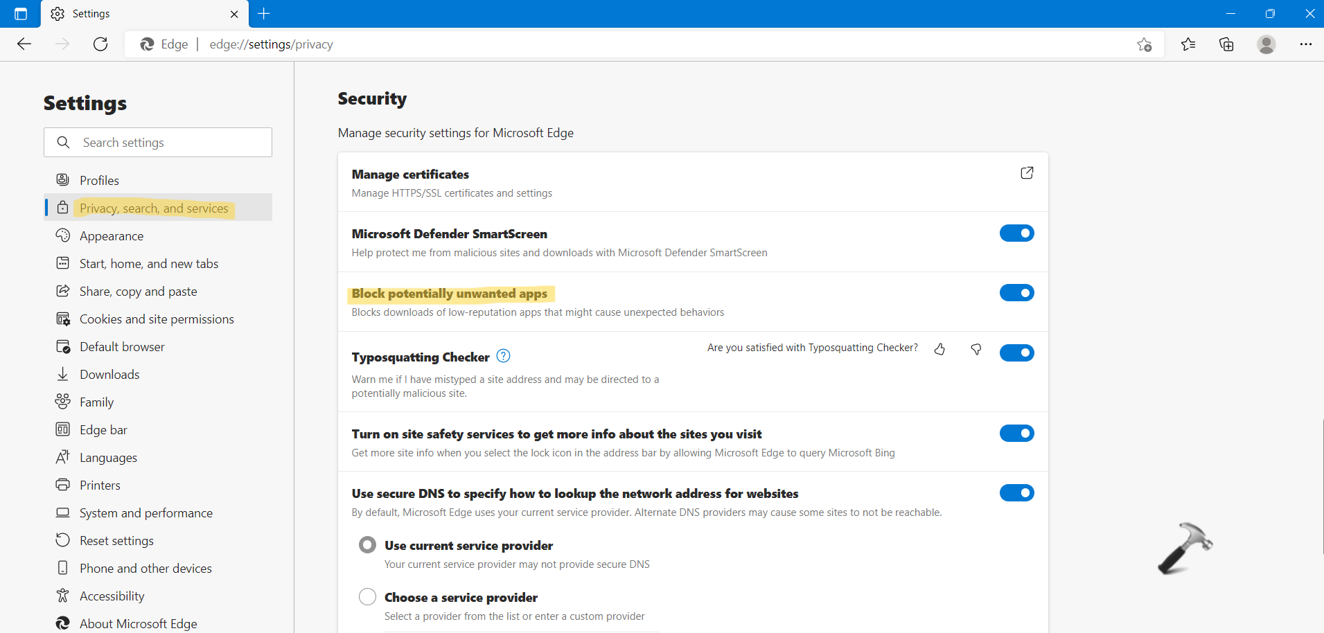 2.A seguir, clique emPrivacidade, pesquisa e serviçospresente no lado esquerdo. Na guia Segurança, ativeBloqueie aplicativos potencialmente indesejadospara ativar a proteção PUA.