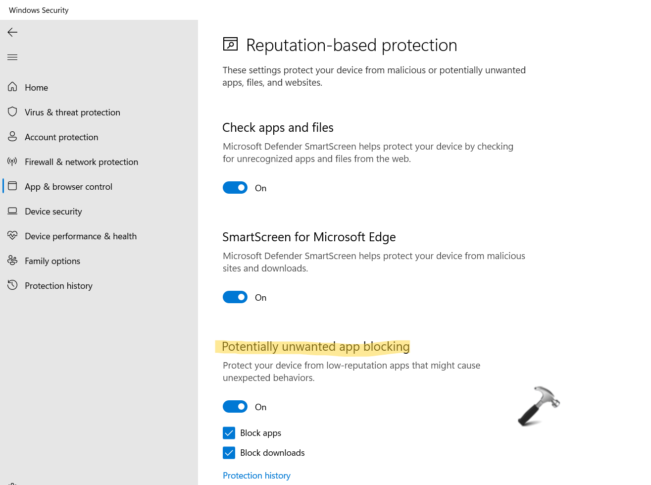 3.Agora, ligueBloqueio de aplicativos potencialmente indesejados. Além disso, ligueBloquear aplicativosassim comoBloquear downloads.