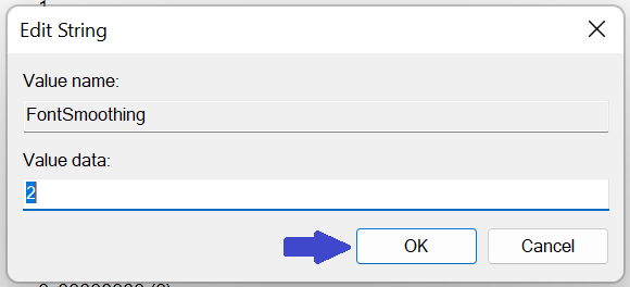 PASSO 3: Clique com o botão direito em FontSmoothing. A caixa de prompt abaixo aparecerá. Você só precisa alterar o valor de 2 para 1.