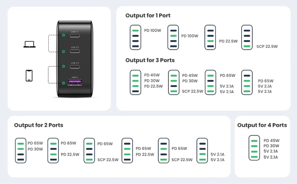 65W é a potência máxima que o Ugreen GaN X 65W oferece. É a potência total de saída e, quando várias portas estão em uso simultaneamente, a potência será dividida entre todas as portas. O fornecimento de energia de todas as portas é diferente e aqui está um gráfico para ajudá-lo a entender isso melhor.