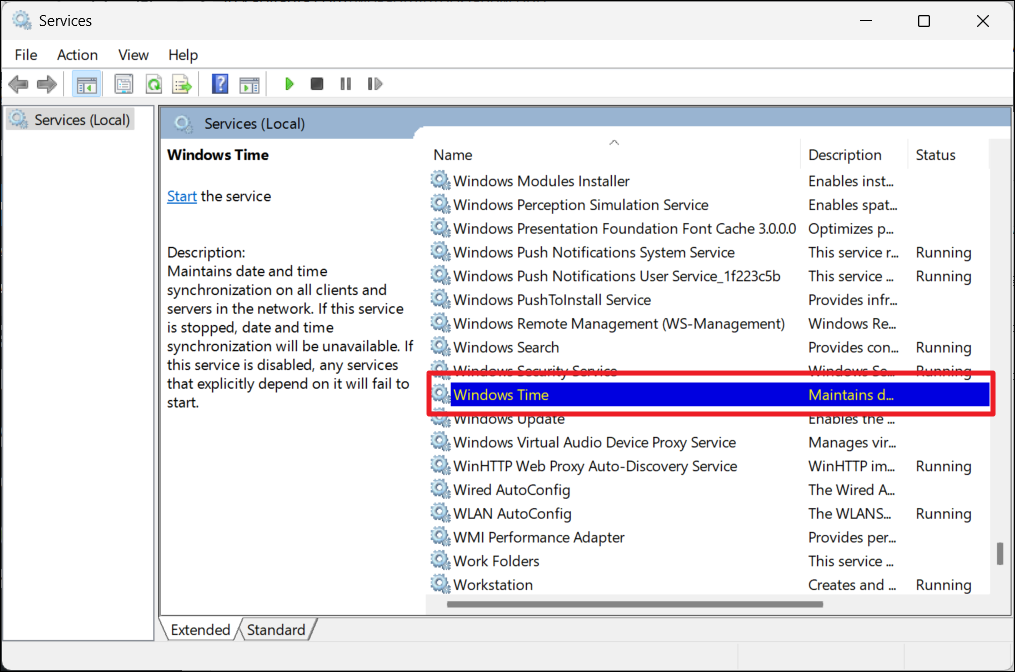 3. Localize o “Hora do Windows”Serviço, clique com o botão direito nele e selecione“Propriedades“.