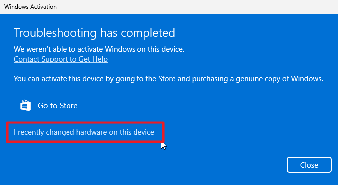 3. Clique no botão “Recentemente mudei o hardware deste dispositivo”Opção.
