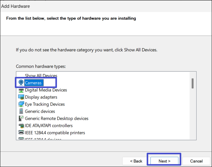 5. Selecione “Câmera"dos tipos de hardware disponíveis e clique em “Próximo“.