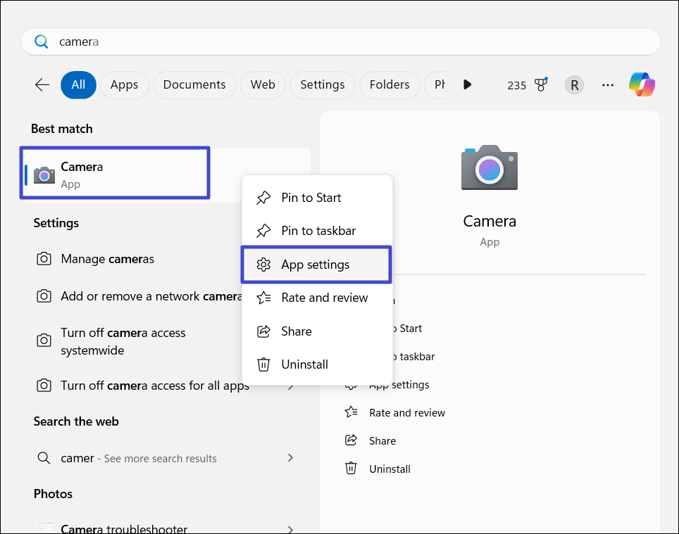 1. Abra o menu Iniciar e digite “câmera". Clique com o botão direito no resultado do aplicativo Câmera e escolha "Configurações do aplicativo“.
