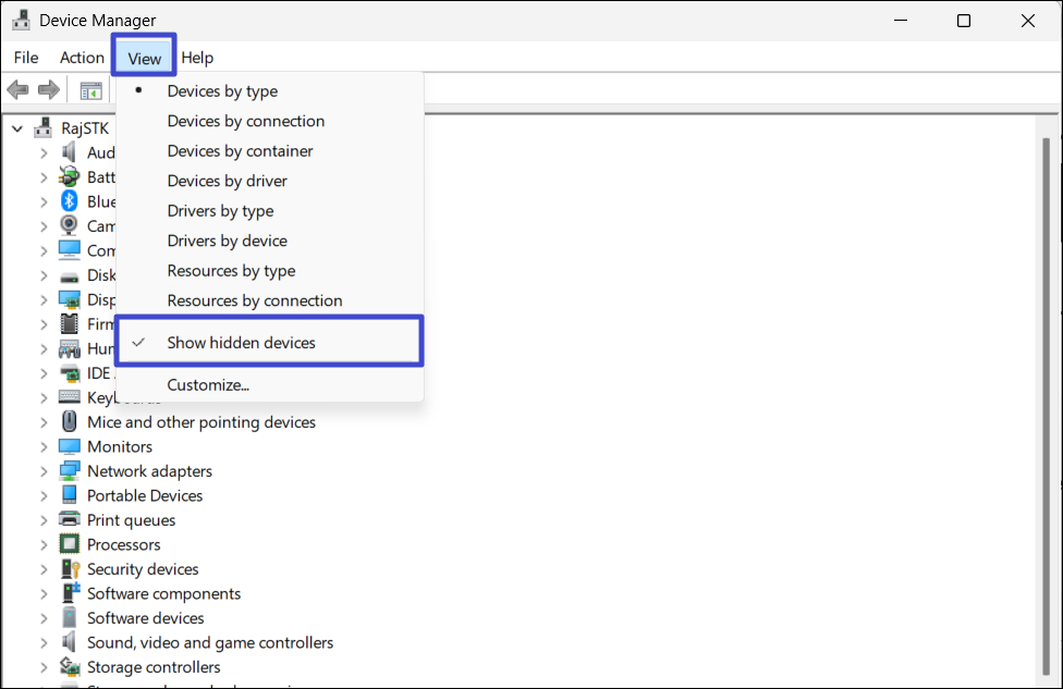2. Clique no botão “Visualizar"menu e veja se há uma marca de seleção antes de “Mostrar dispositivos ocultos"Opção. Se não houver nenhuma marca de seleção, clique na opção “Mostrar dispositivos ocultos”Opção para visualizar dispositivos ocultos.