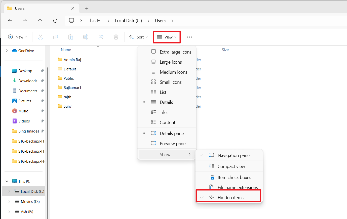 Se o diretório padrão não estiver visível, clique no botão “Visualizar"menu, passe o mouse sobre “Mostrar“, e clique/marque o “Itens ocultos”Opção.