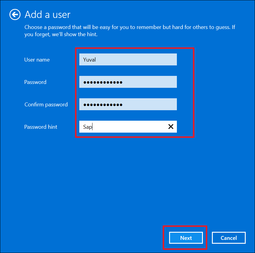 5. Agora, preencha oNome de usuário, Senha, Confirmar senha,eDica de senhacampos conforme sua escolha e clique em “Próximo“.