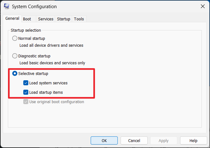 2. Sob oEm geralguia, selecione “Inicialização seletiva”, e verifique“Carregar serviços do sistema" e "Carregar itens de inicialização.”