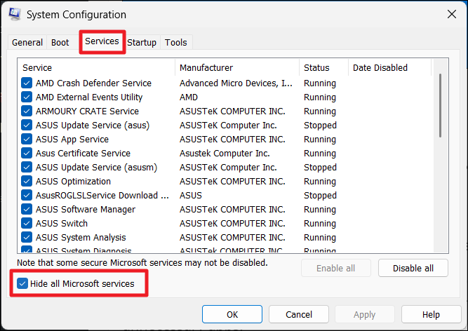 4. Clique em “Status"na parte superior e verifique todos os serviços em execução. Em seguida, clique em “Desativar tudo“.