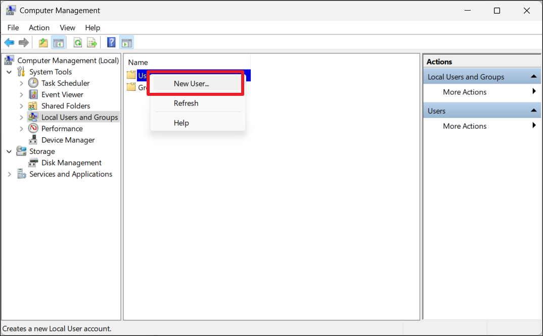 3. Clique com o botão direito em “Usuários"pasta e escolha “Novo usuário...”.
