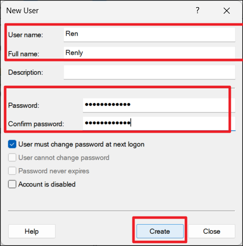 4. Digite seu nome de usuário, nome completo e senha. Em seguida, clique no botão “Criar" botão.