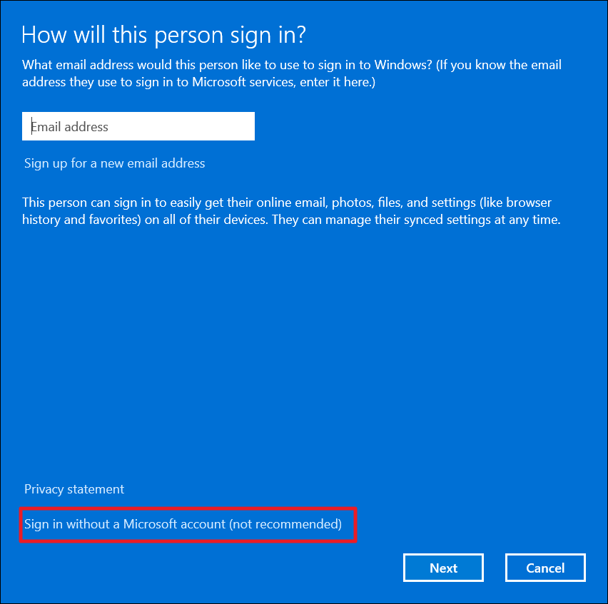 3. Agora você tem duas opções. Se você deseja criar uma conta da Microsoft, insira seuE-mail da Microsoftendereço e clique em “Próximo“.Para criar uma conta local, clique em “Faça login sem uma conta da Microsoft (não recomendado)“.
