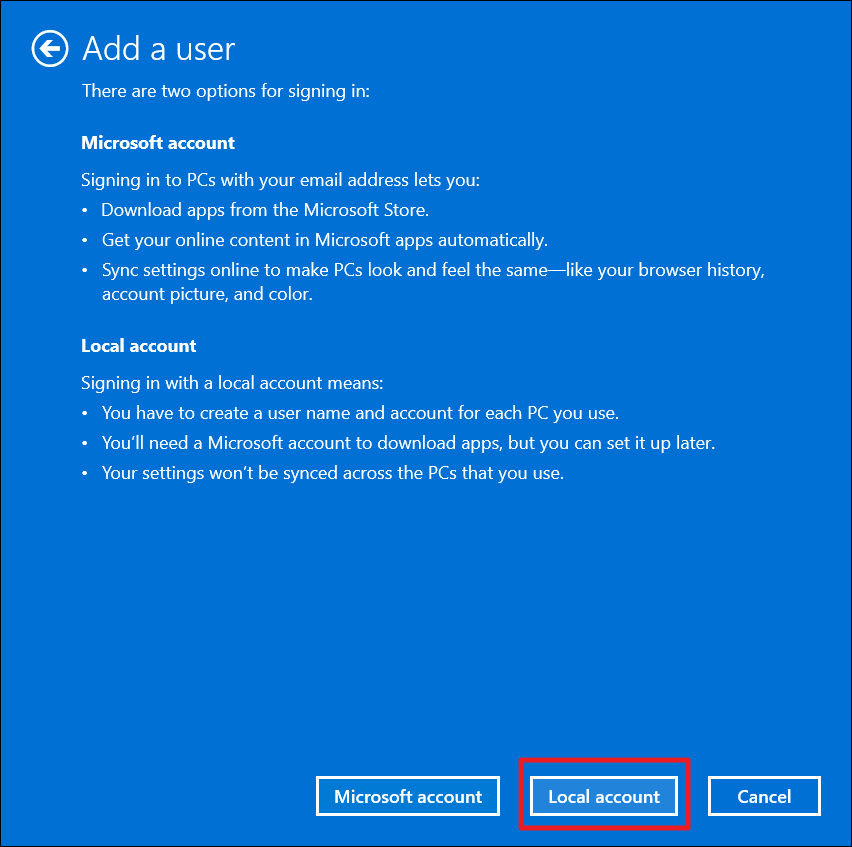 4. Se você deseja criar uma conta local, clique em “Conta local“.