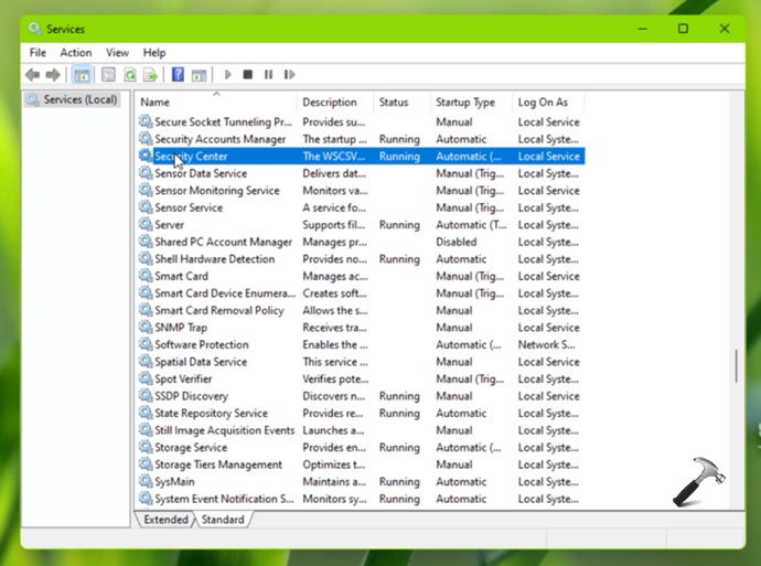 2.Em Serviços, role para baixo e localize oCentral de Segurançaserviço. Como você está enfrentando esse problema, o serviço pode não estar em execução e estar definido como Desativado.