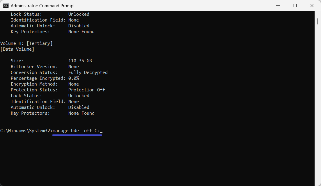 2. Em seguida, execute o seguinte comando para desabilitar o BitLocker: