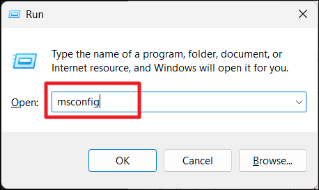 1. Abra a caixa de diálogo Executar, digite “msconfig”e pressione Enter.