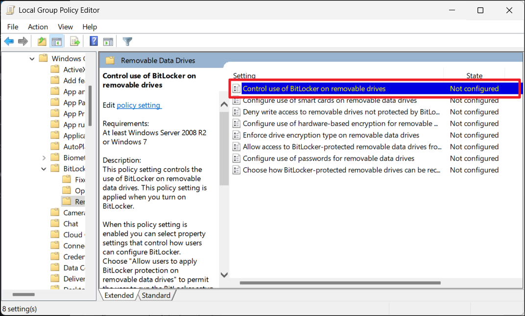 3. Clique duas vezes em “Controlar o uso do BitLocker em unidades removíveis" política.